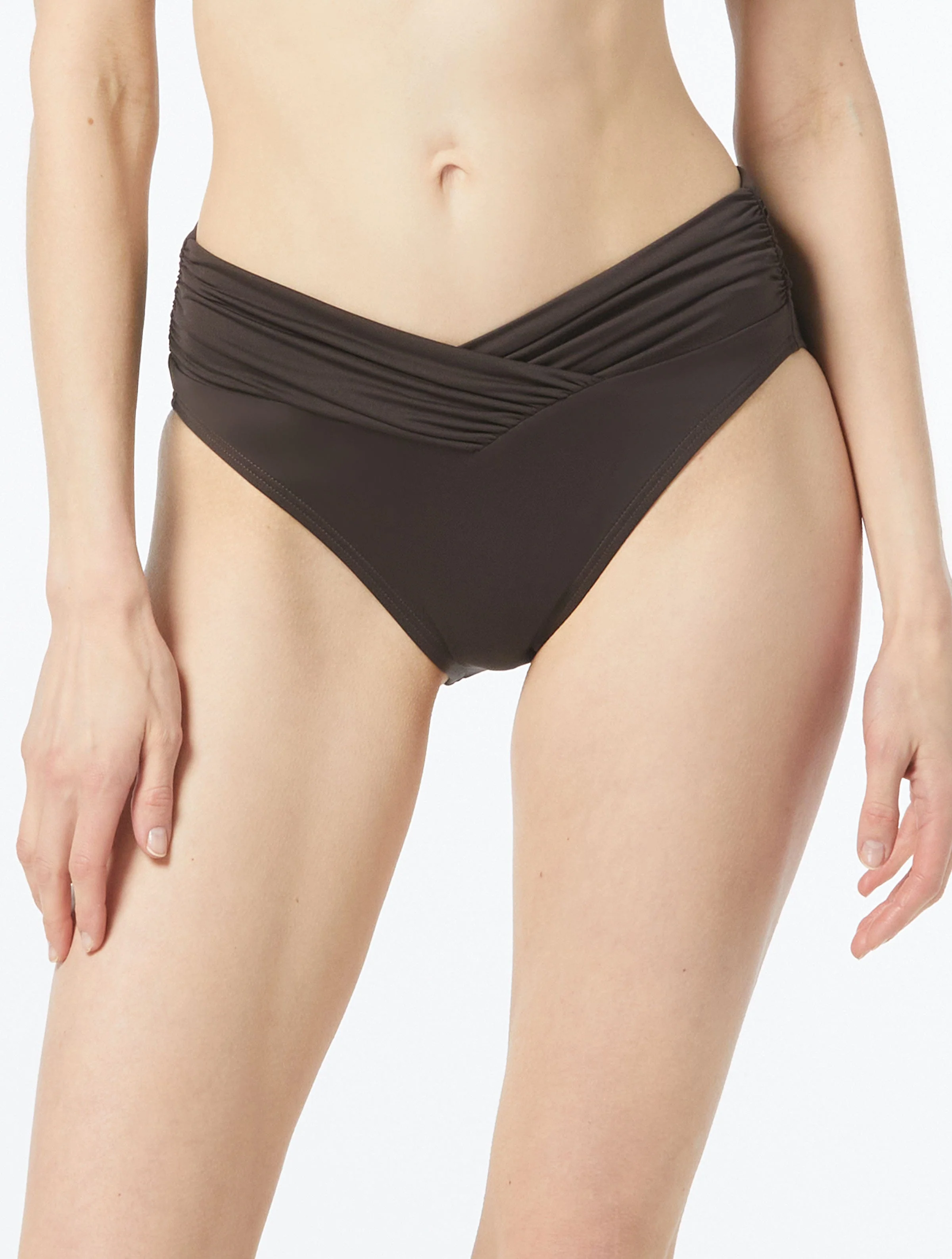 Retro inspired and ready for the beach! The MICHAEL Michael Kors Shirred High Leg Bikini Bottom in desert inspired solids is paired with a shirred v-waistband and high leg for a statement swimwear bottom.